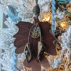 “Ammonite” with Leaves and Lilies Leather Purse Charm . A lovely set of hand cut SoRetro leather leaves suspended with a beautiful set of leather hand cut lilies. Each lily has a small hand dyed wooden bead in the center. Also included is a very sweet lamp work bead just below the swivel clasp. I have also included a gorgeous Ammonite porcelain pendant. This purse charm is made with antique bronze hardware. Approx. length is 7.5 inches.