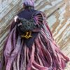 “Bag Lady Garden” with beautiful shades of my hand dyed Sari Silks, an adorable embossed bag filled with vegetables, garden gloves and snail pin pendant on a hand cut SoRetro leather feather. All bronze hardware used.