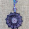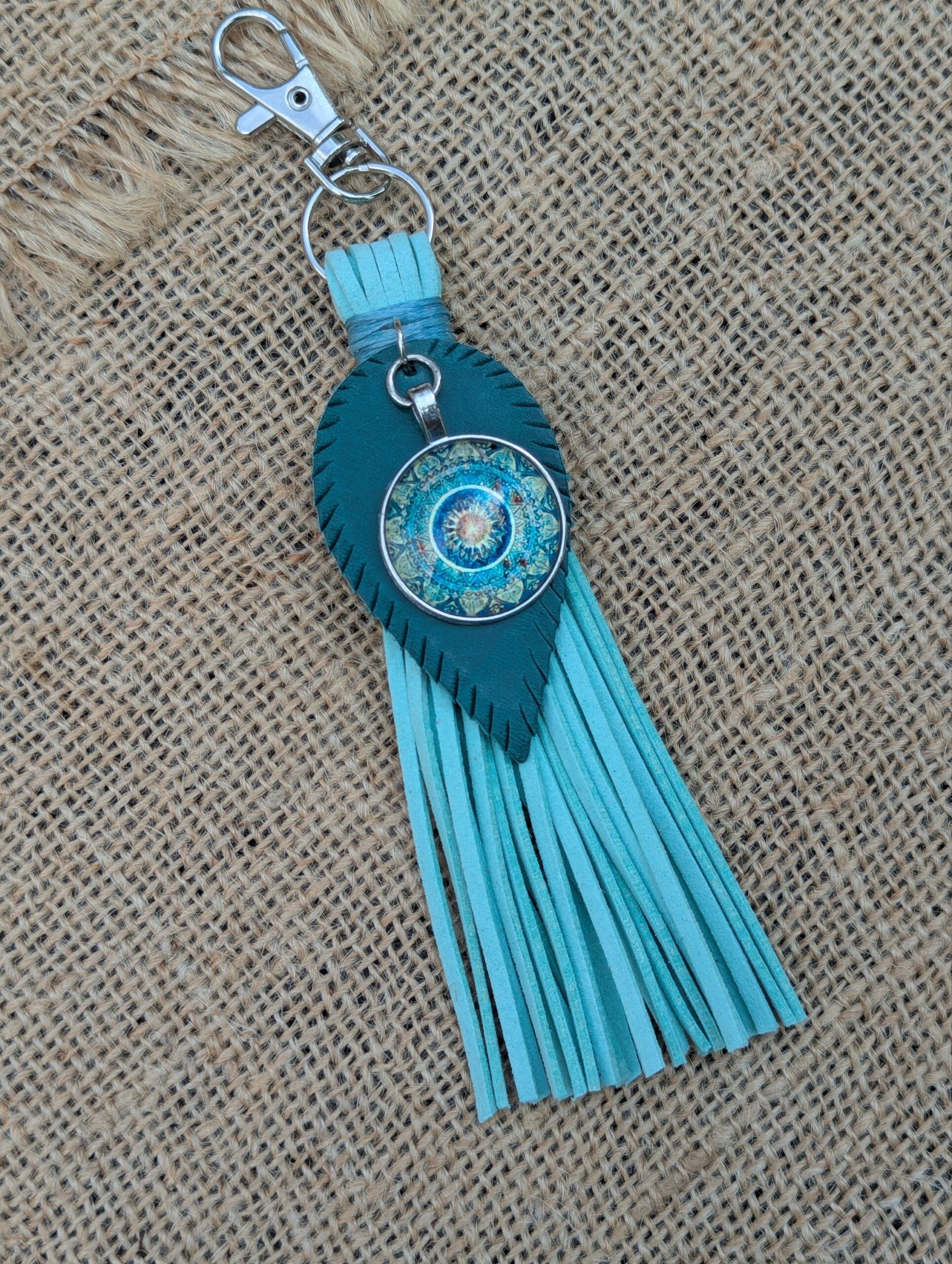 #415-Beautiful Pendant  Purse Charm tassel is made with a lovely solar sun pendant suspended on a hand cut SoRetro leather leaf and then with lovely hand wrapped strands of vegan leather.