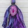 “Blue Floral Paradise” with beautiful shades of hand dyed Sari Silks, a stunning flower pin pendant on a hand cut SoRetro leather feather. All chromalusion hardware used.