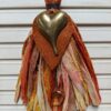 “Bronze Maple Leaf with Acorns Pendant” Sari Silk Purse Charm! Lovely shades of my hand dyed Sari Silks with a beautiful partially folded bronze maple leaf pendant suspended it on a sweet hand cut SoRetro leather feather. I then added a sweet set of acorns on the leaf and a double strand of lovely chocolate brown seed beads. All bronze hardware on this beauty!