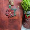 #514- Christmastime Flower Leather Purse Charm. Made with a set of two SoRetro leather flower petal layers and a hand stitched center! I then suspended it with a lovely leaf behind the double layer of petals. The hardware I used on this is gunmetal!