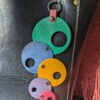#322-Circles, Circles and more Circles Purse Charm is made with several different sizes of circles with more circles cut from these circles!  All made from SoRetro Leathers and connected together using silver hardware.