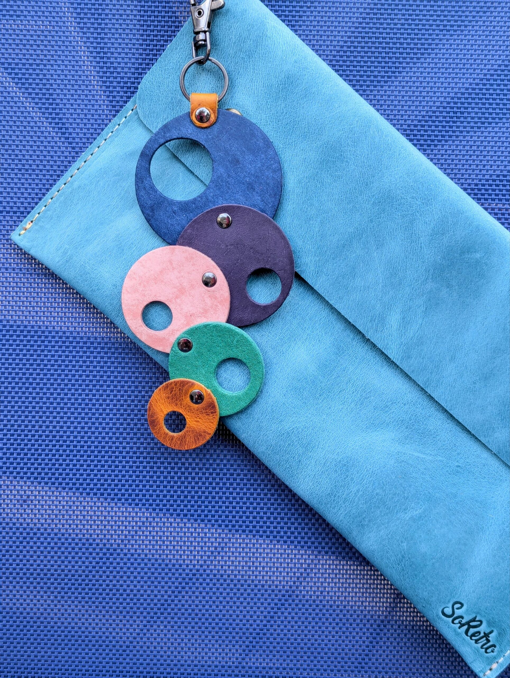 #337-Circles, Circles and more Circles Purse Charm is made with several different sizes of circles and then more circles! All made from SoRetro Leathers and connected together using gunmetal hardware.