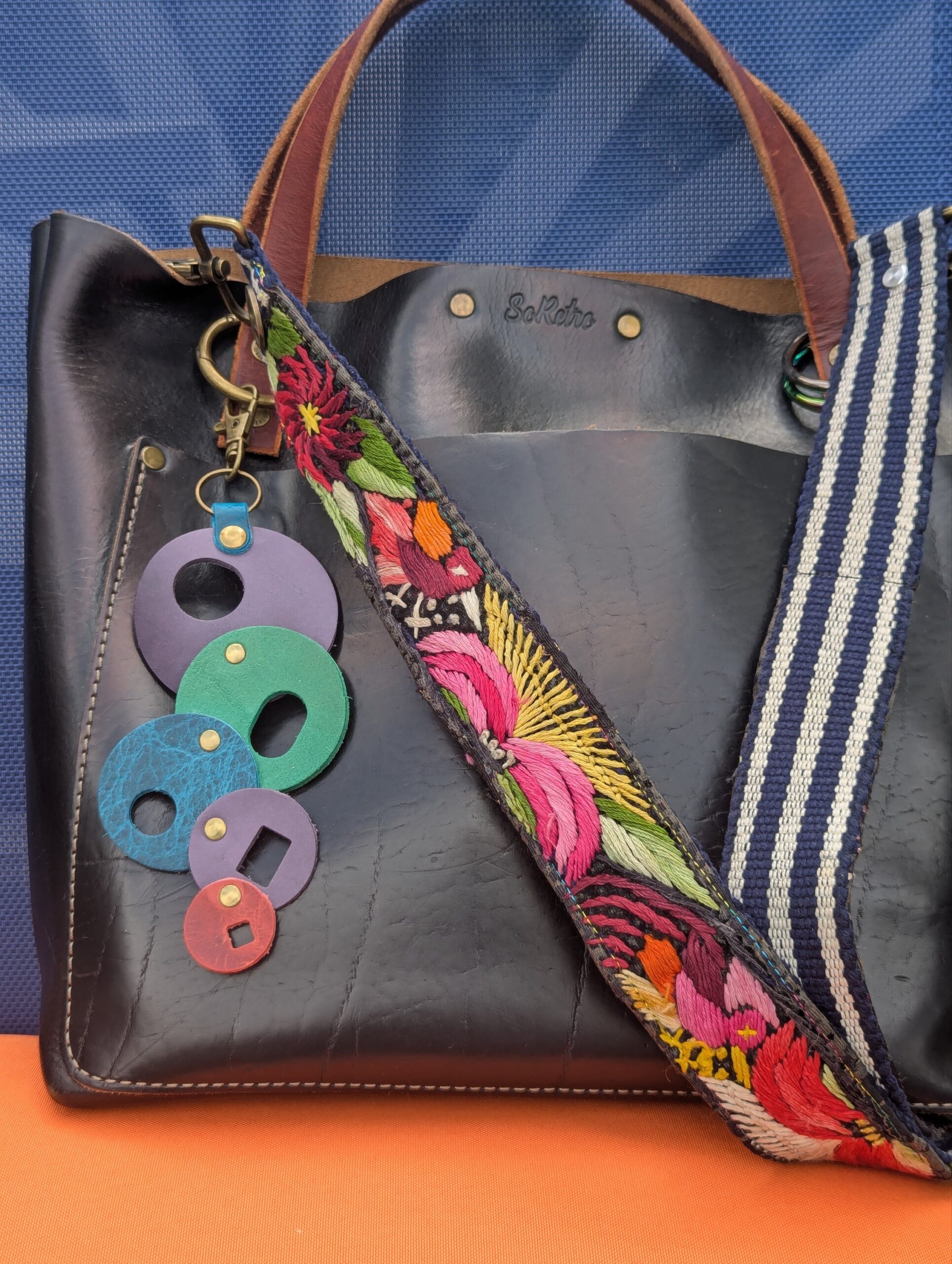 #333-Circles, Circles and more Shapes Purse Charm is made with several different sizes of circles and geometric shapes! All made from SoRetro Leathers and connected together using antique bronze hardware.