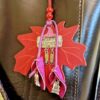 #475-Fall Vibes Purse Charm. Adorable Halloween charms, on this hand cut and etched SoRetro leather maple leaf. This purse charm is made with ant. bronze hardware and lovely porcelain beads above the charms! You will love this sweet Fall/Halloween creation!