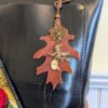 #479-Fall Vibes Purse Charm. A cute group of charms on this hand cut and etched set of SoRetro leather leaves. This purse charm is made using ant. bronze hardware and lovely porcelain beads above the charms! You will love this sweet Fall/Halloween creation!