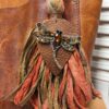 “Fantasy Orchid” with beautiful shades of Sari Silks, a gorgeous crystal encrusted orchid blossom pin pendant on a hand cut SoRetro leather feather. All antique bronze hardware used.