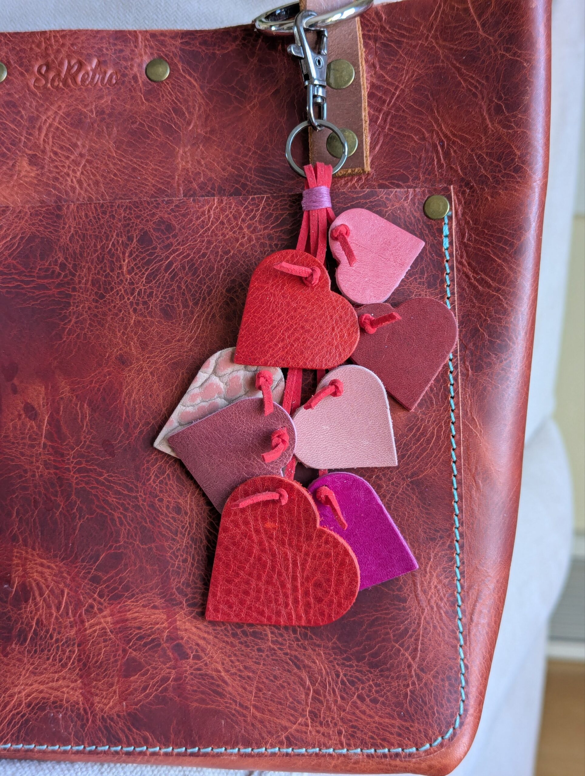 #568 Floating Hearts Purse Charm Tassel!! So cute and adorable! Multiple SoRetro leather hearts suspended on multiple strands of vegan leather. This is made using gunmetal hardware!