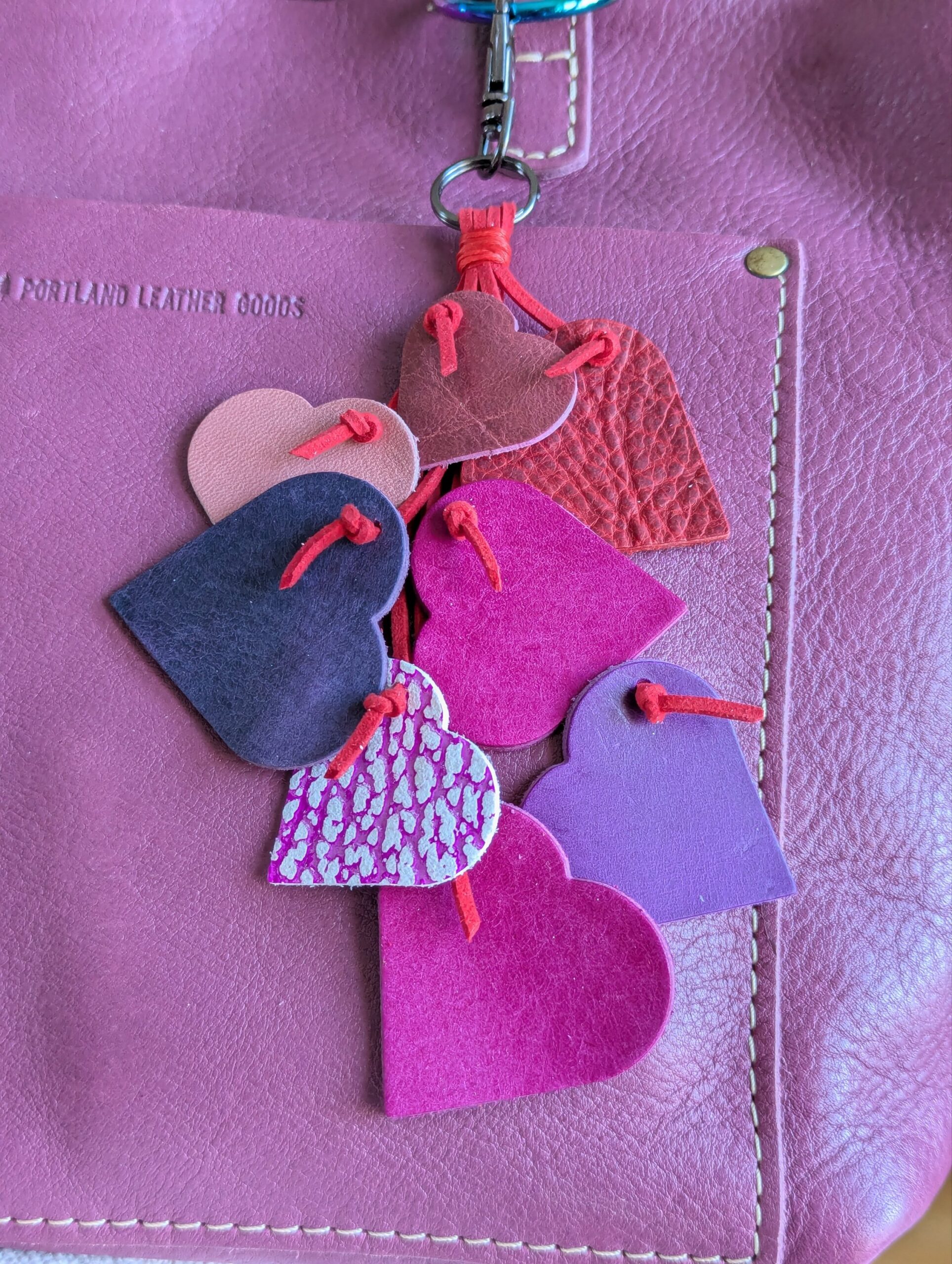 #569 Floating Hearts Purse Charm Tassel!! So cute and adorable! Multiple SoRetro leather hearts suspended on multiple strands of vegan leather. This is made using gunmetal hardware!