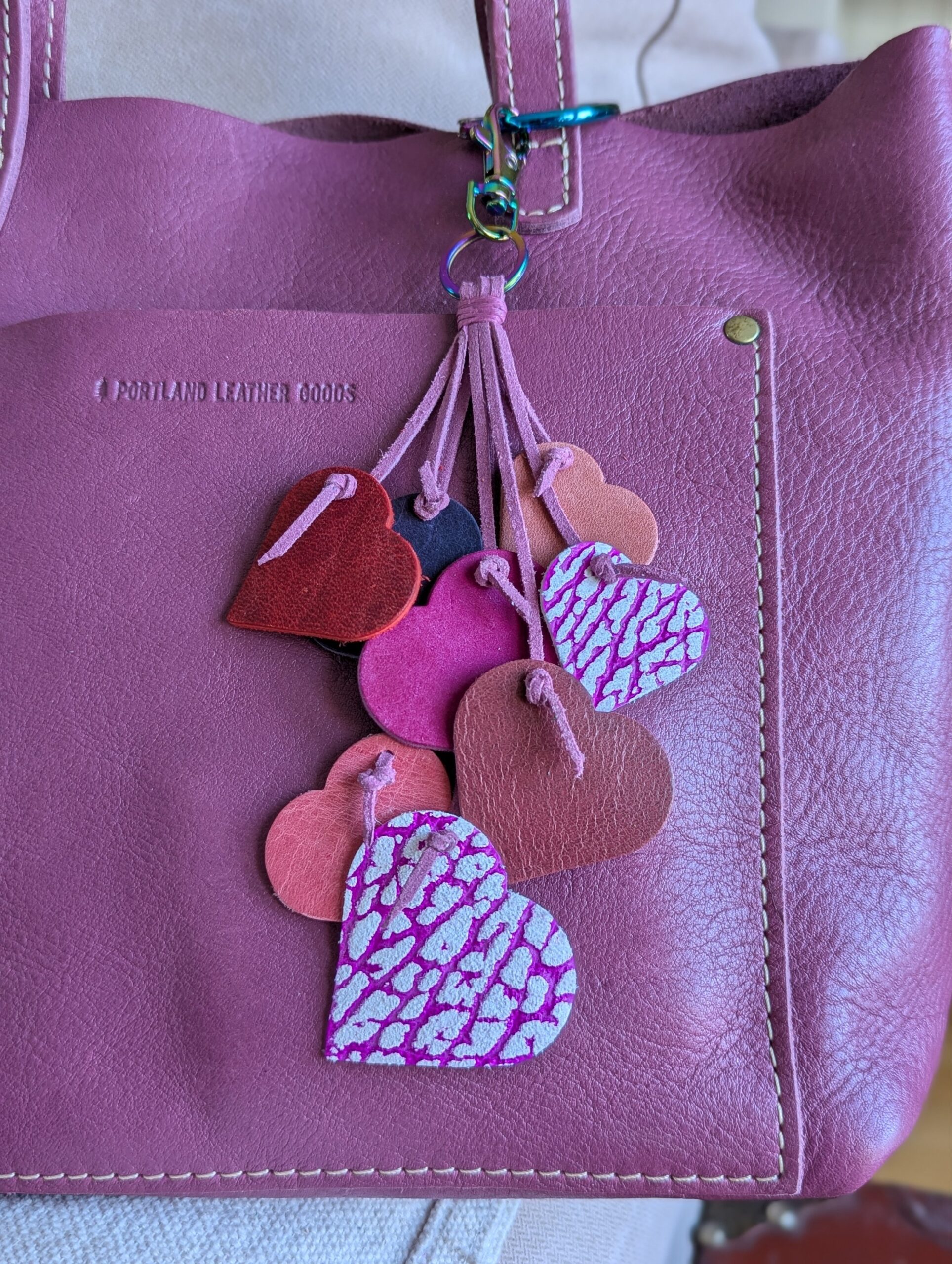 #570 Floating Hearts Purse Charm Tassel!! So cute and adorable! Multiple SoRetro leather hearts suspended on multiple strands of vegan leather. This is made using chromalusion hardware!