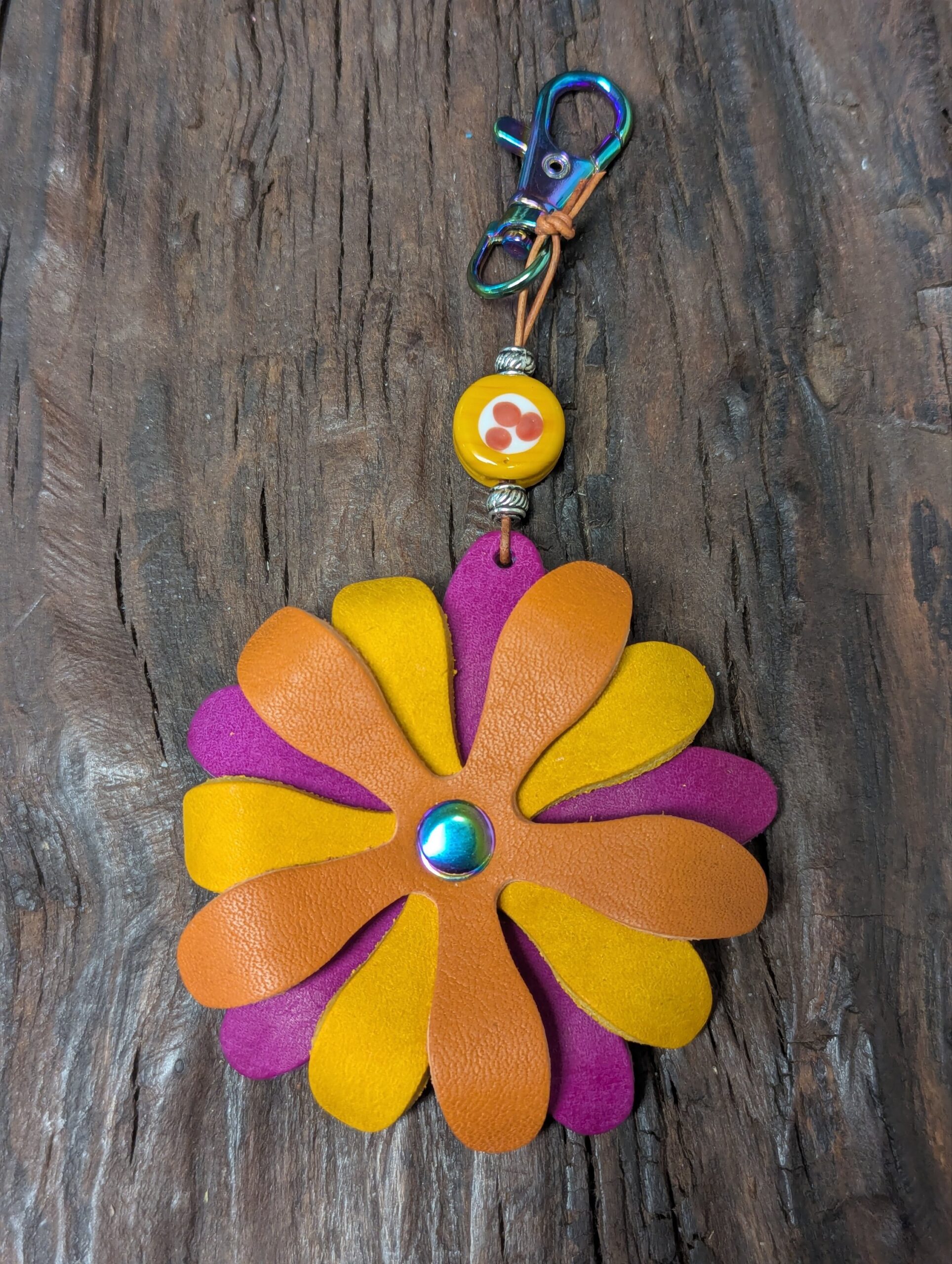 #563- New Flower Leather Purse Charm. Made with a set of three SoRetro leather flower petal layers and suspended with a sweet handmade lampwork bead on a lovely clasp. The hardware I used on this is chromalusion!