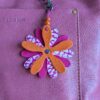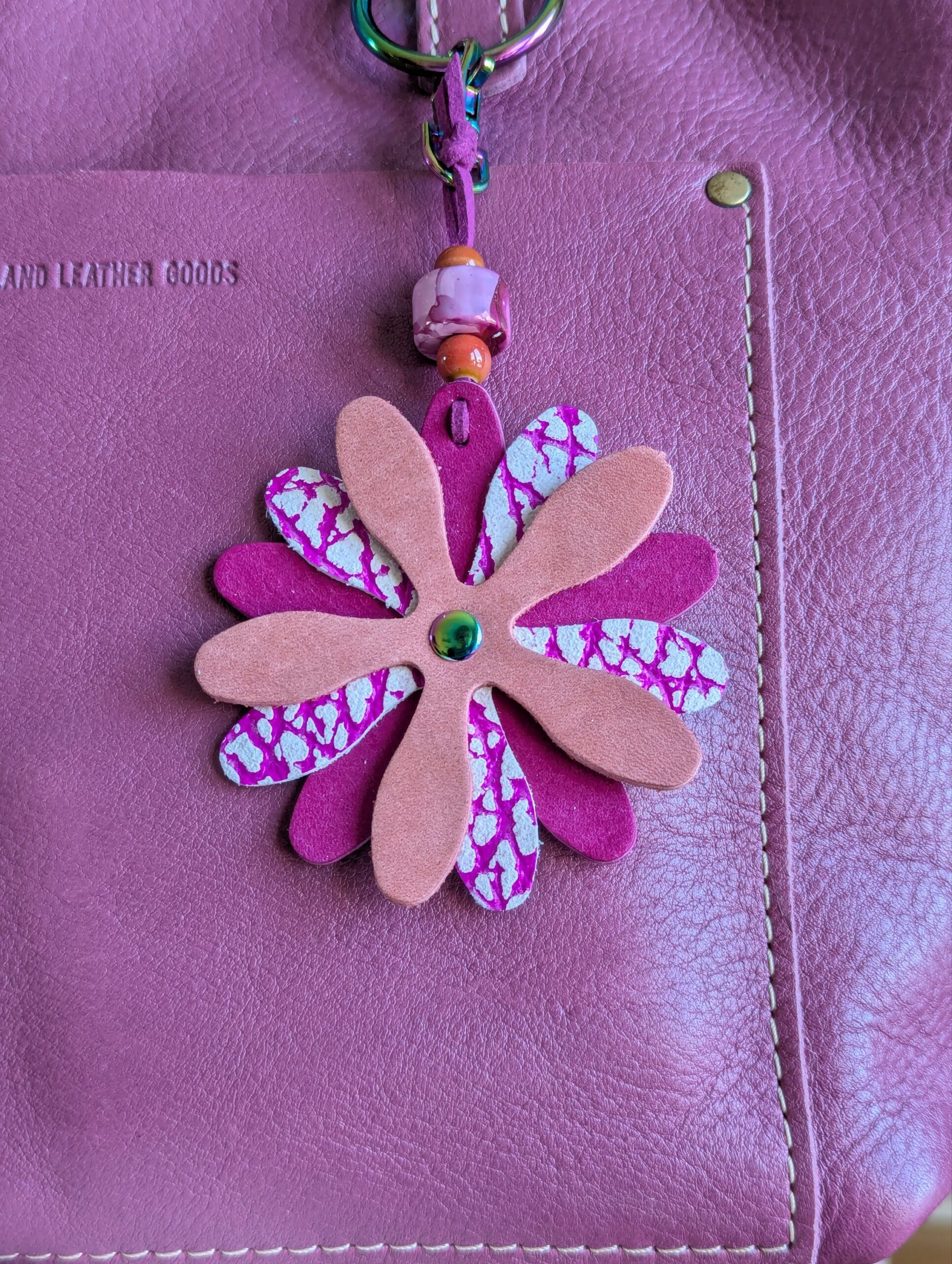 #566- New Flower Leather Purse Charm. Made with a set of three SoRetro leather flower petal layers and suspended with a beautiful lampwork bead on a lovely clasp. The hardware I used on this is chromalusion!