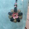 #217- New Flower Power Button Leather Purse Charm. Made with a set of two SoRetro leather flower petal layers, a hand stitched center with a wooden button sewn onto the center! I then suspended with a beautiful set of lampwork and ceramic or wooden beads on a lovely clasp. I have used antique bronze hardware.