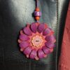 #225- New Flower Power Button Leather Purse Charm. Made with a set of two SoRetro leather flower petal layers, hand stitched center with a wooden button sewn onto the center! I then suspended with a beautiful set of lampwork and ceramic or wooden beads on a lovely clasp. I have used gunmetal hardware.