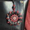 #229- New Flower Power Button Leather Purse Charm. Made with a set of two SoRetro leather flower petal layers, leather flower center with a wooden button sewn onto the flower! I then suspended it with a beautiful set of lampwork and ceramic or wooden beads on a lovely clasp. I have used chromalusion hardware.