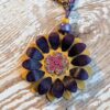#231- New Flower Power Button Leather Purse Charm. Made with a set of two SoRetro leather flower petal layers, hand stitched center with a wooden button sewn onto the center! I then suspended with a beautiful set of lampwork and ceramic or wooden beads on a lovely clasp. I have used ant. bronze hardware.