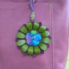 #297- New Flower Power Button Leather Purse Charm. Made with a set of two SoRetro leather flower petal layers and a hand stitched center with a wooden button! I then suspended with a beautiful set of lampwork and ceramic on a lovely clasp. The hardware I used on this is chromalusion!