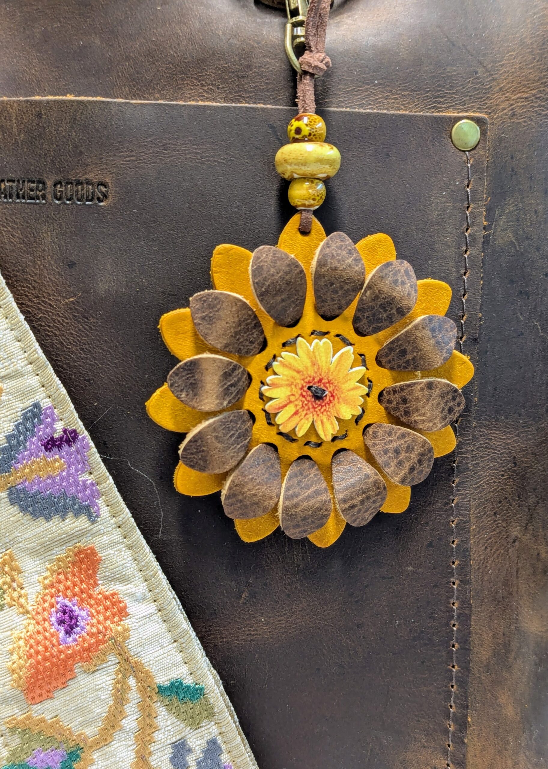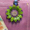 #367- New Flower Power Button Leather Purse Charm.  Made with a set of two SoRetro leather flower petal layers, a hand stitched center around a beautiful flower button center!   I then suspended with a beautiful set of lampwork and ceramic beads on a lovely clasp.  The hardware I used on this is antique bronze!