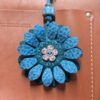 #375- New Flower Power Button Leather Purse Charm. Made with a set of two SoRetro leather flower petal layers, a hand stitched center around a beautiful flower button center! I then suspended it with a beautiful set of lampwork and ceramic beads on a lovely clasp. The hardware I used on this is antique bronze!