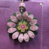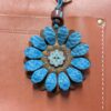 #377- New Flower Power Button Leather Purse Charm. Made with a set of two SoRetro leather flower petal layers, a hand stitched center around a beautiful flower button center! I then suspended it with a beautiful set of lampwork and ceramic beads on a lovely clasp. The hardware I used on this is antique bronze!