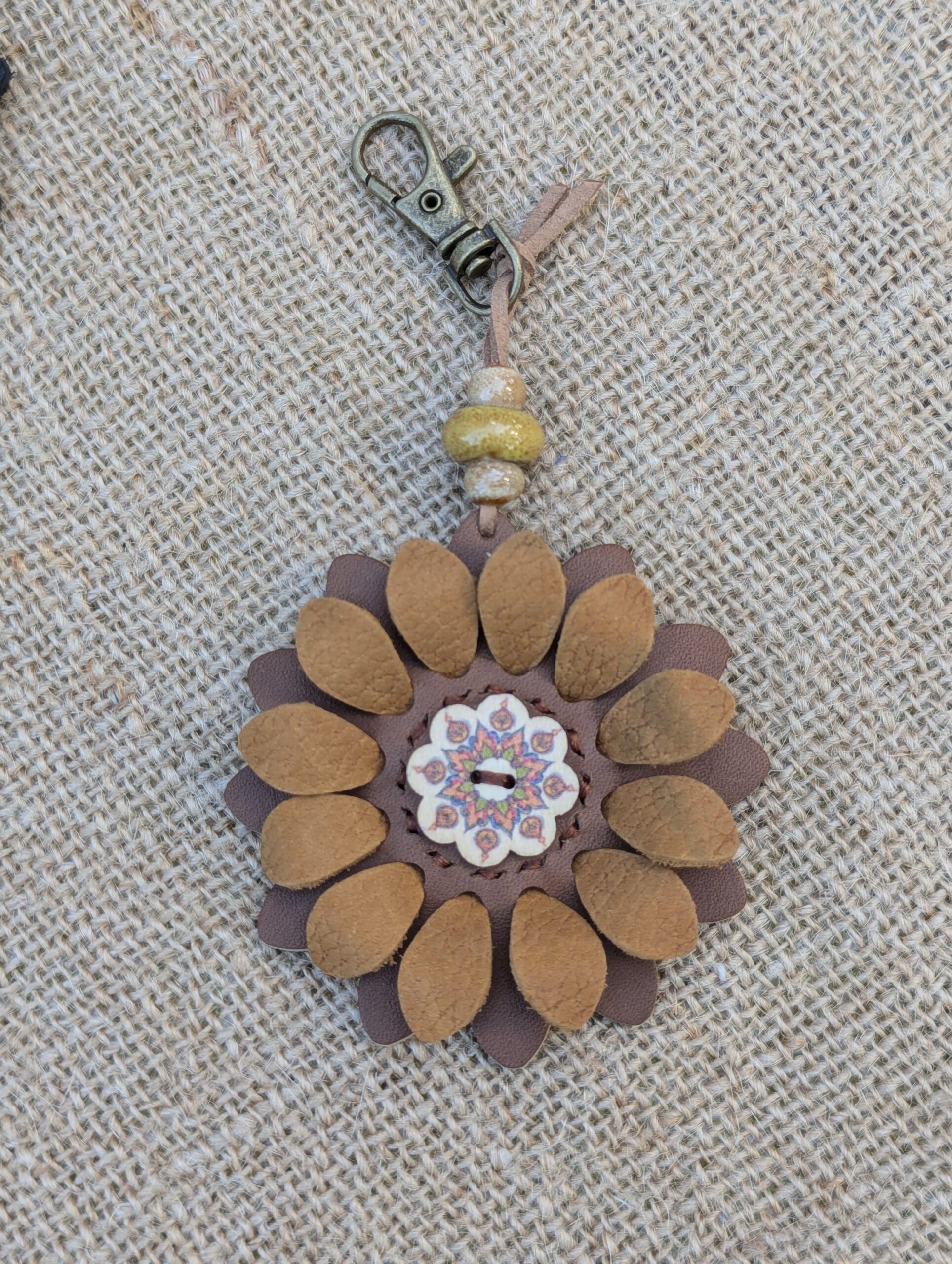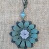 #395- New Flower Power Button Leather Purse Charm. Made with a set of two SoRetro leather flower petal layers, a hand stitched center around a beautiful flower button center! I then suspended it with a beautiful set of lampwork and ceramic beads on a lovely clasp. The hardware I used on this is antique bronze but I can change it to another color if you put a request in the notes section.