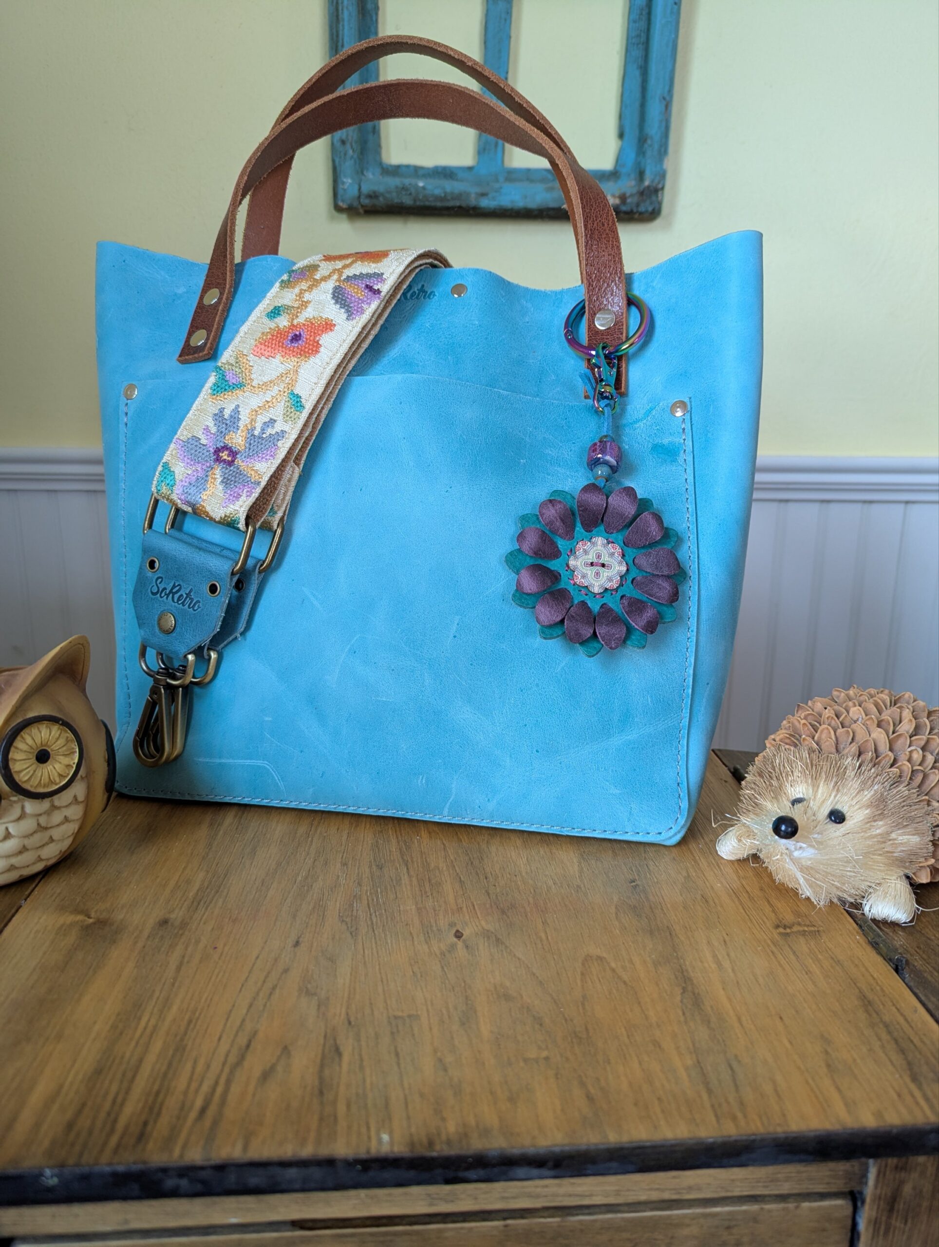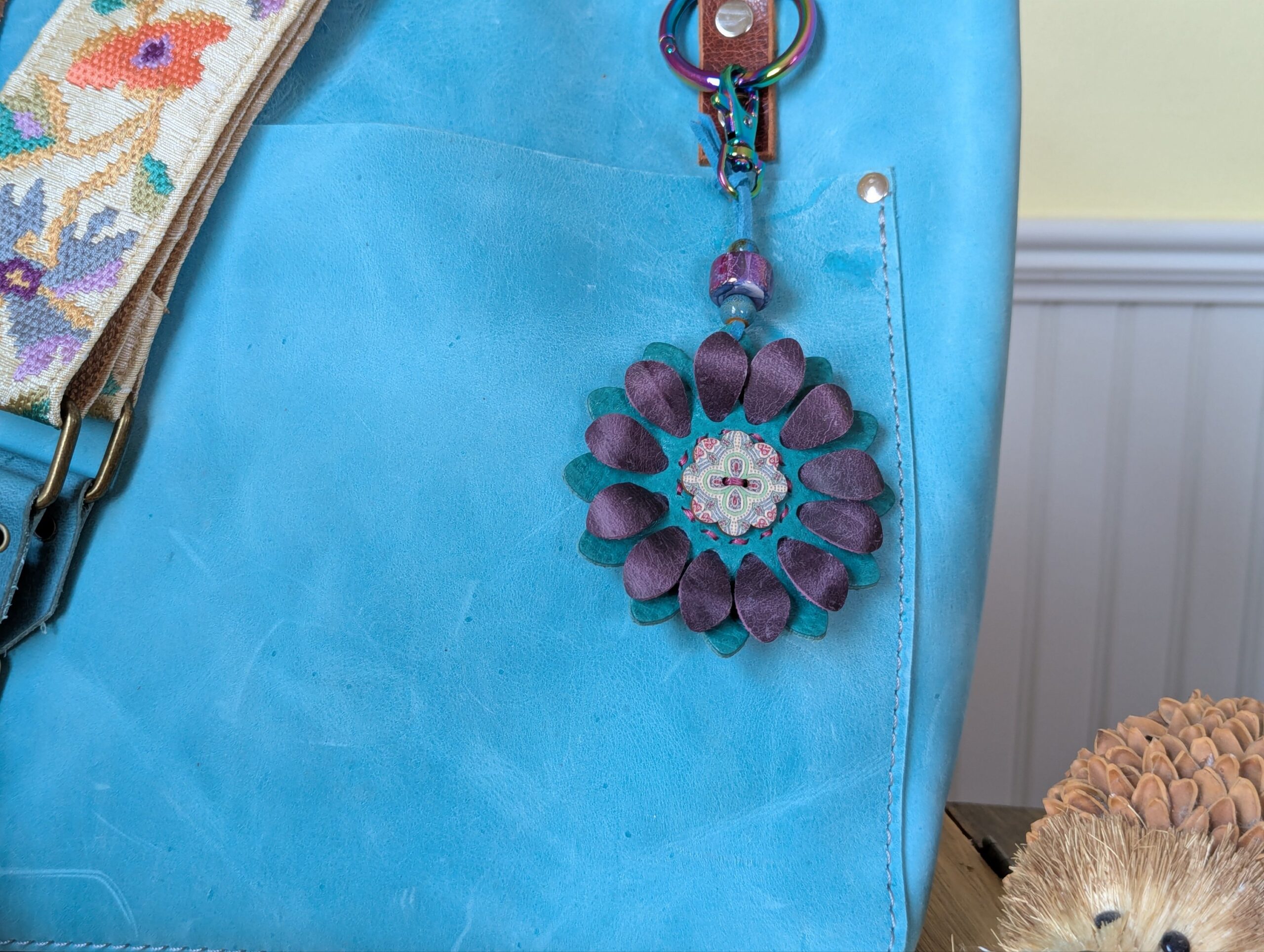 #400- New Flower Power Button Leather Purse Charm. Made with a set of two SoRetro leather flower petal layers, a hand stitched center around a beautiful flower button center! I then suspended it with a beautiful set of lampwork and ceramic beads on a lovely clasp. The hardware I used on this is chromalusion but I can change it to another color if you put a request in the notes section.