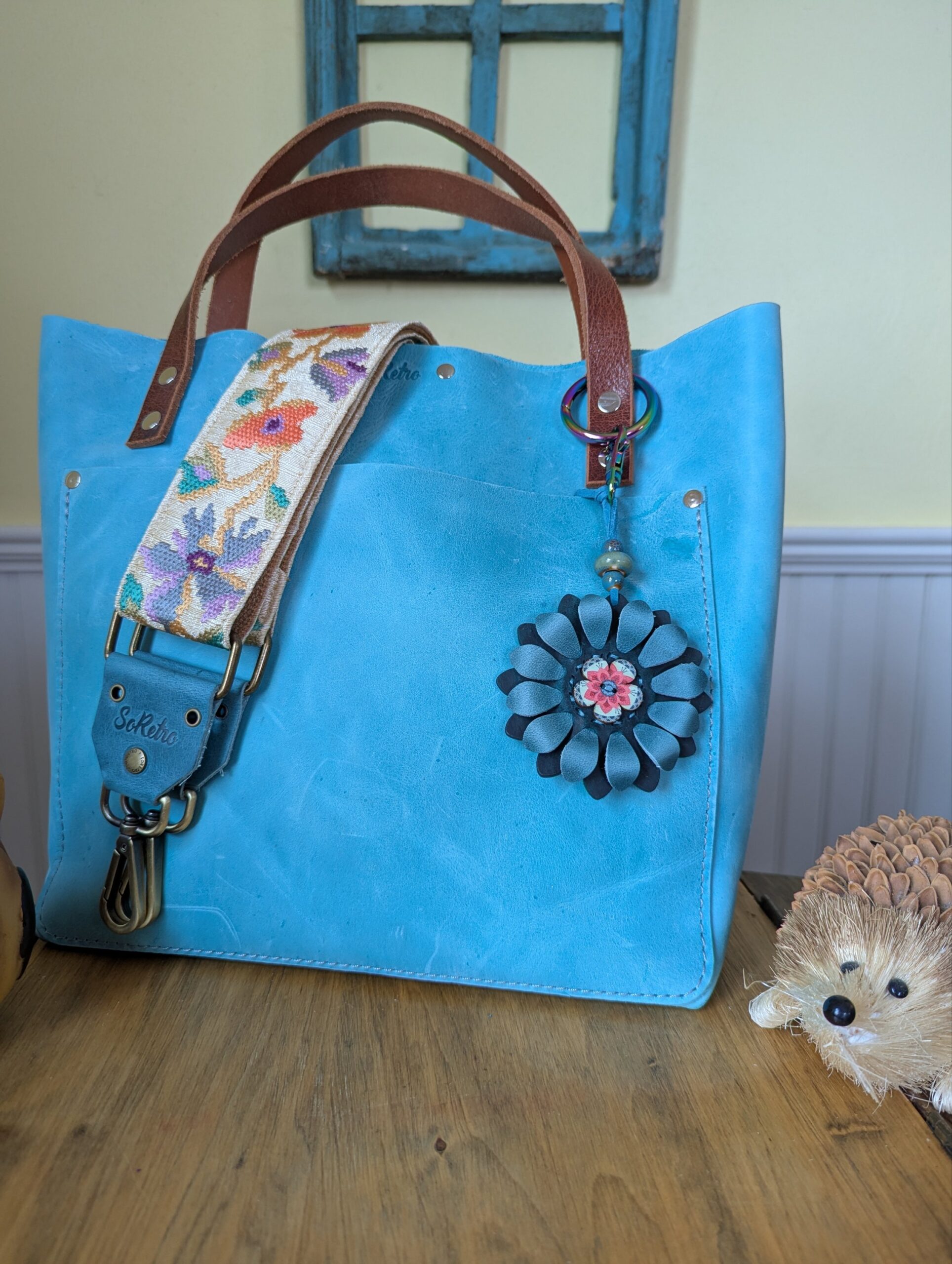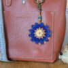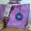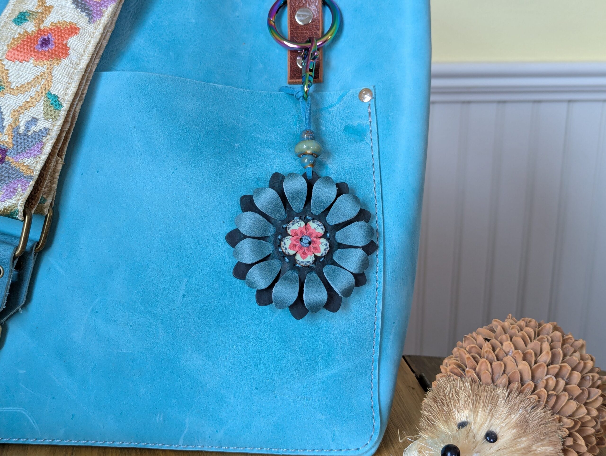 #450- New Flower Power Button Leather Purse Charm. Made with a set of two SoRetro leather flower petal layers, a hand stitched center around a beautiful flower button center! I then suspended it with a beautiful set of lampwork and ceramic beads on a lovely clasp. The hardware I used on this is chromalusion but I can change it to another color if you put a request in the notes section or message me here: https://www.facebook.com/DazzleDesignsJewelry