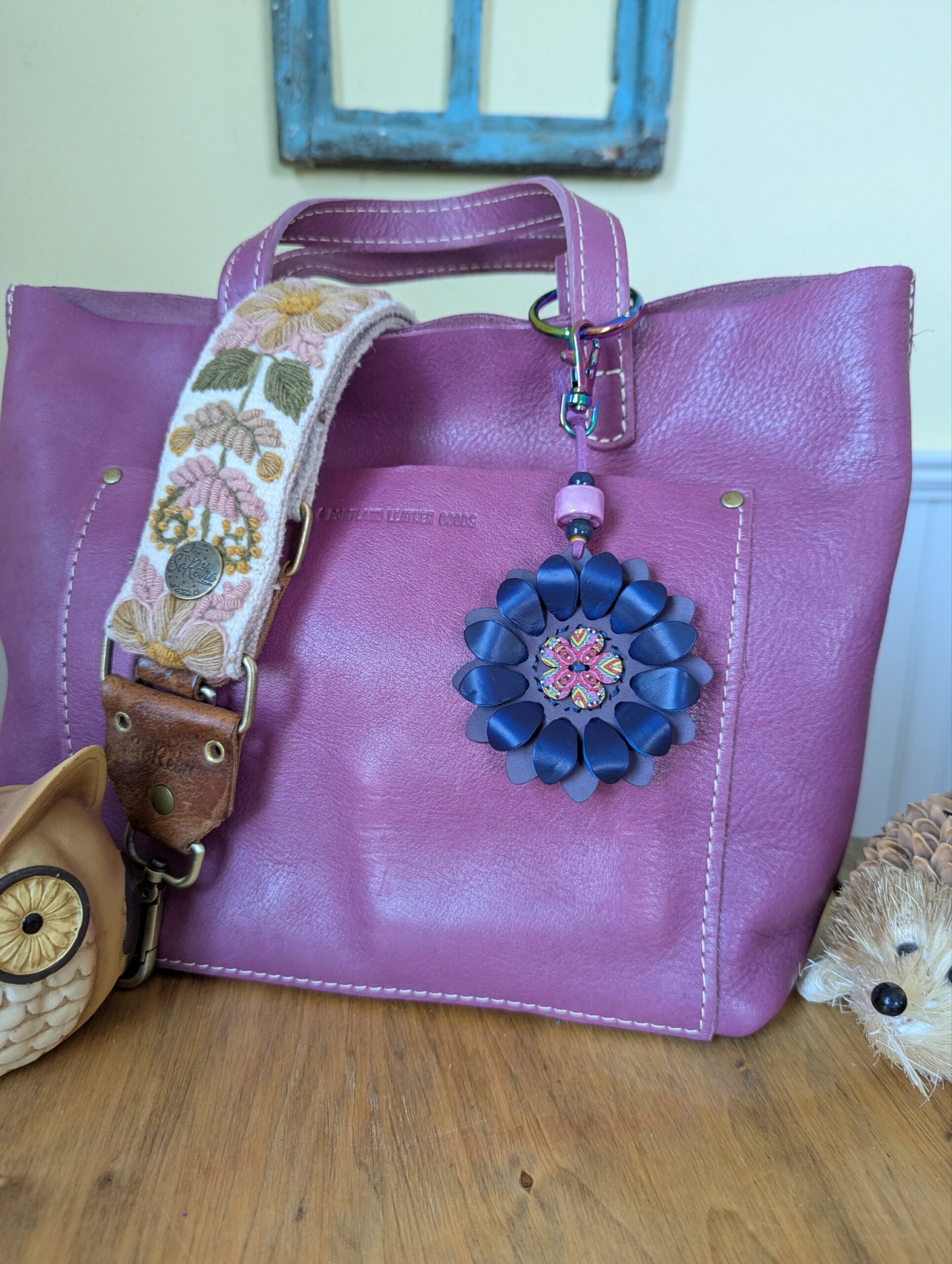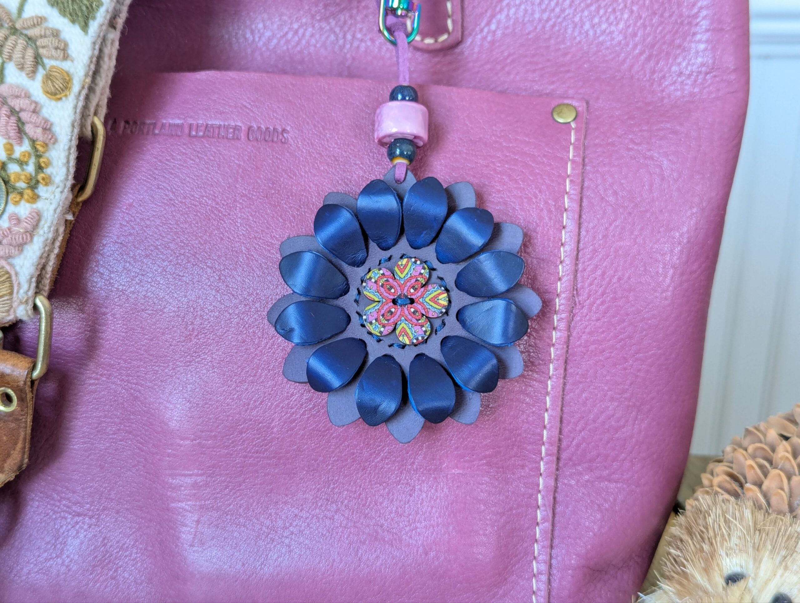 #444- New Flower Power Button Leather Purse Charm. Made with a set of two SoRetro leather flower petal layers, a hand stitched center around a beautiful flower button center! I then suspended it with a beautiful set of lampwork and ceramic beads on a lovely clasp. The hardware I used on this is chromalusion but I can change it to another color if you put a request in the notes section or message me here: https://www.facebook.com/DazzleDesignsJewelry