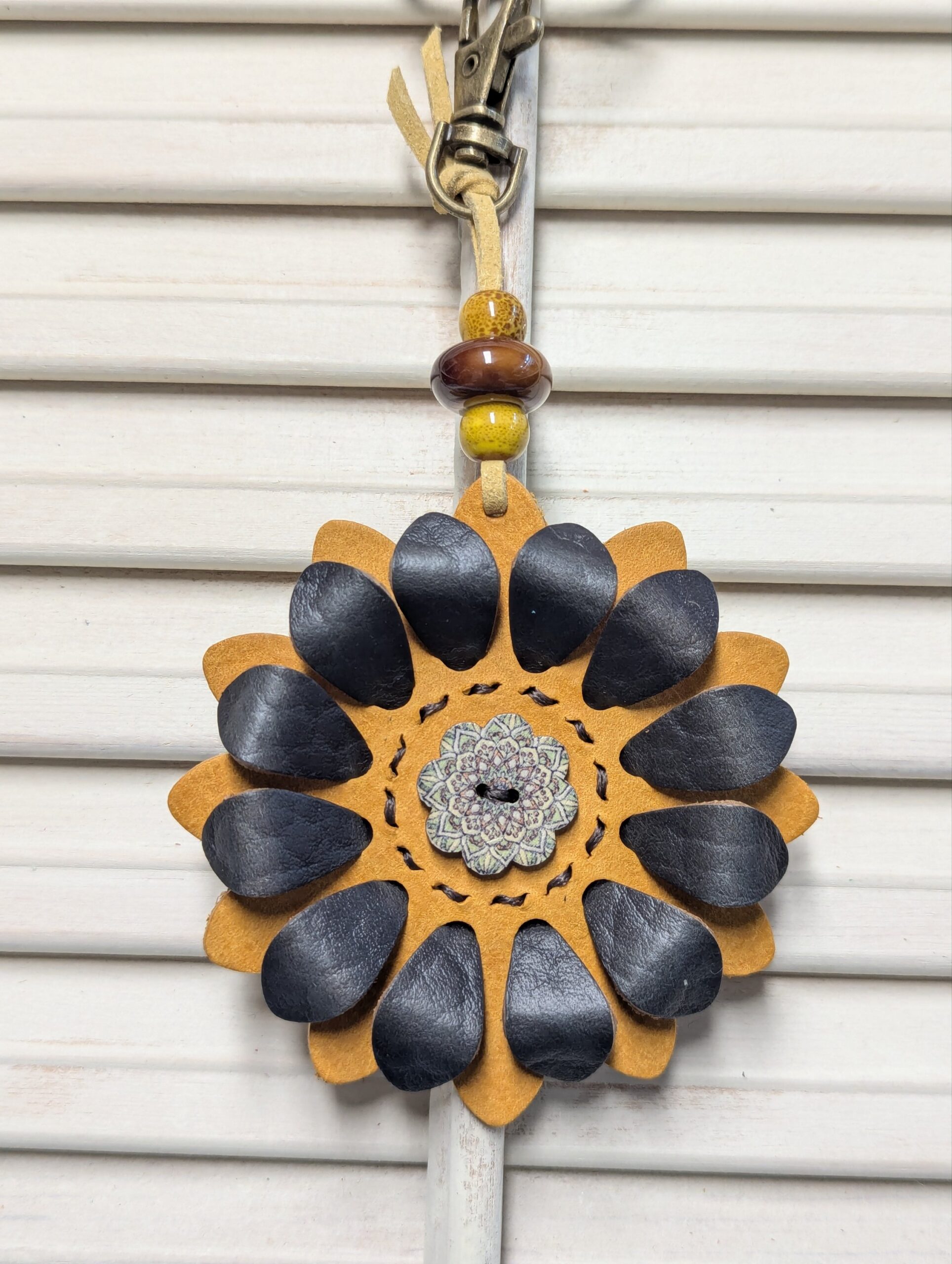 #448- New Flower Power Button Leather Purse Charm. Made with a set of two SoRetro leather flower petal layers, a hand stitched center around a beautiful flower button center! I then suspended it with a beautiful set of lampwork and ceramic beads on a lovely clasp. The hardware I used on this is bronze but I can change it to another color if you put a request in the notes section or message me here: https://www.facebook.com/DazzleDesignsJewelry