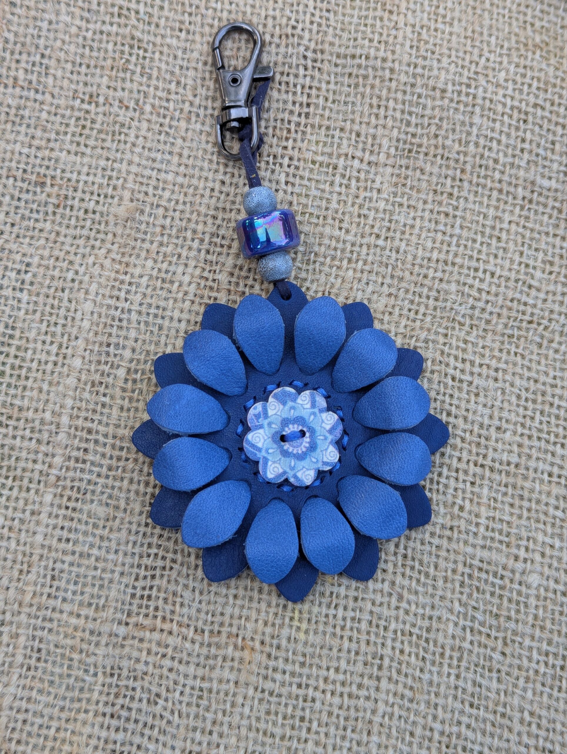 #412- New Flower Power Button Leather Purse Charm. Made with a set of two SoRetro leather flower petal layers, a hand stitched center around a beautiful flower button center! I then suspended it with a beautiful set of lampwork and ceramic beads on a lovely clasp. The hardware I used on this is gunmetal but I can change it to another color if you put a request in the notes section or message me here: https://www.facebook.com/DazzleDesignsJewelry