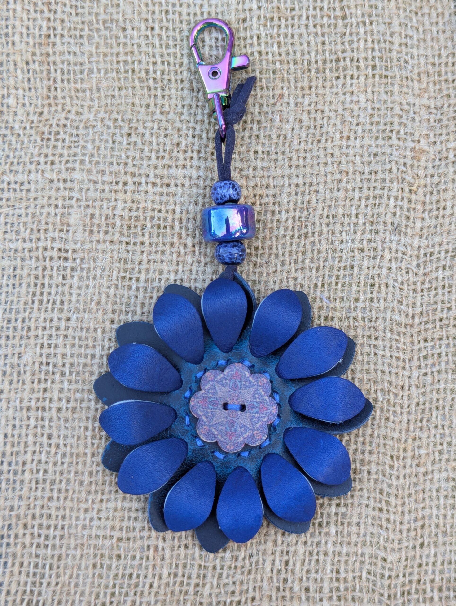 #419- New Flower Power Button Leather Purse Charm.  Made with a set of two SoRetro leather flower petal layers, a hand stitched center around a beautiful flower button center!   I then suspended it with a beautiful set of lampwork and ceramic beads on a lovely clasp.  The hardware I used on this is chromalusion but I can change it to another color if you put a request in the notes section or message me here: https://www.facebook.com/DazzleDesignsJewelry