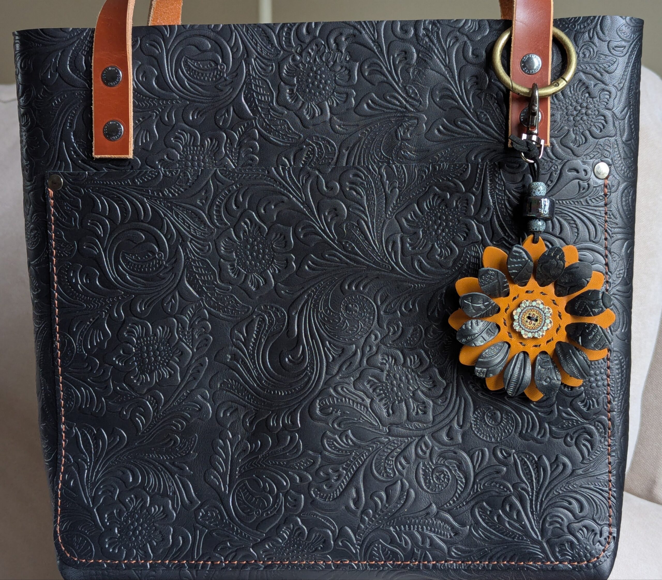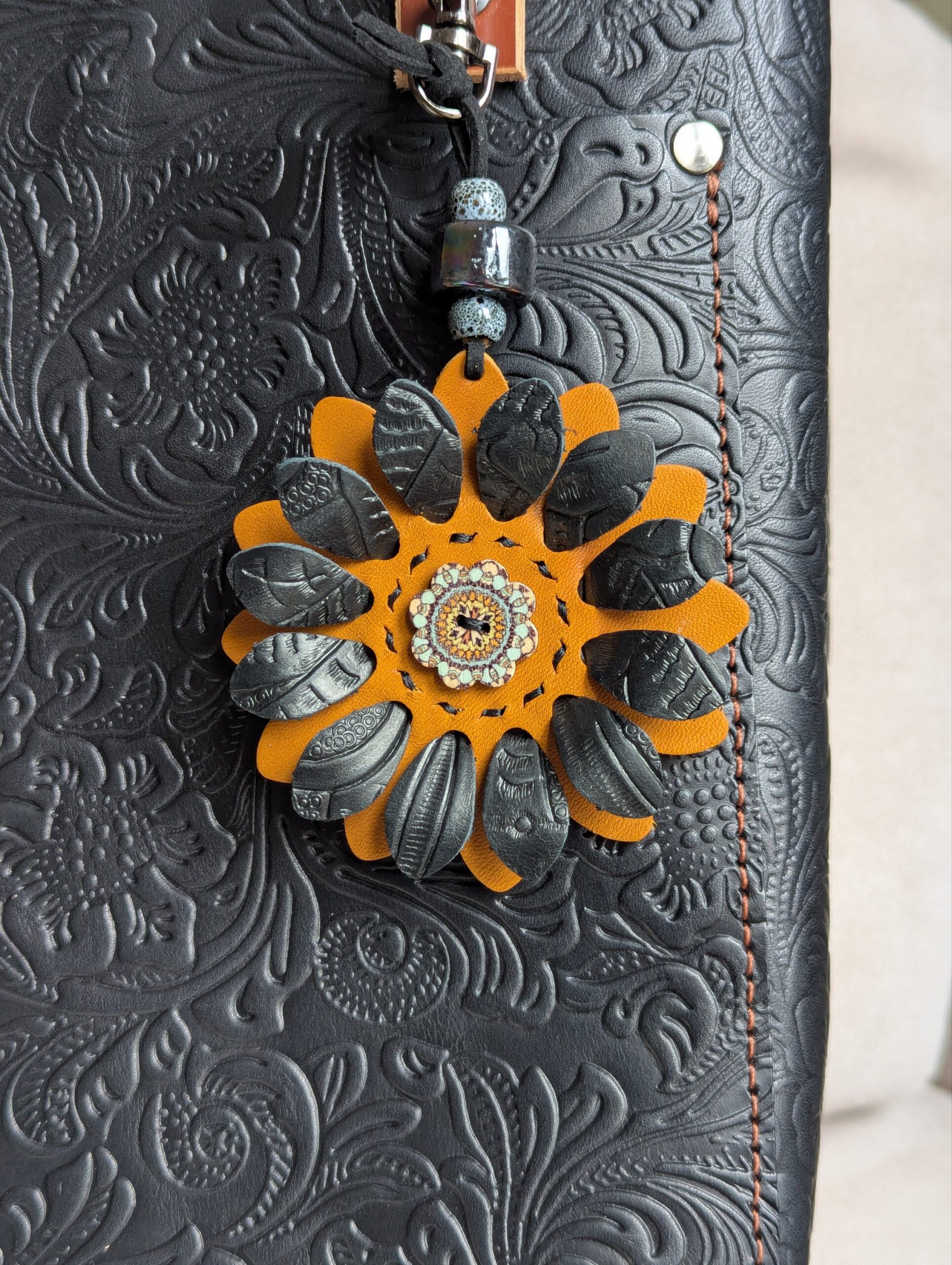 #490- New Flower Power Button Leather Purse Charm. Made with a set of two SoRetro leather flower petal layers and a hand stitched center around a beautiful flower button center! I then suspended it with a beautiful set of lampwork and ceramic beads on a lovely clasp. The hardware I used on this is gunmetal but I can change it to another color if you put a request in the notes section or message me here: https://www.facebook.com/DazzleDesignsJewelry