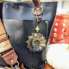 #472- New Flower Power Leather Purse Charm.  Made with a set of two SoRetro leather flower petal layers, and a hand stitched center around a beautiful flower center!   I then suspended with a beautiful set of lampwork and ceramic beads on a lovely clasp.  The hardware I used on this is ant. bronze!
