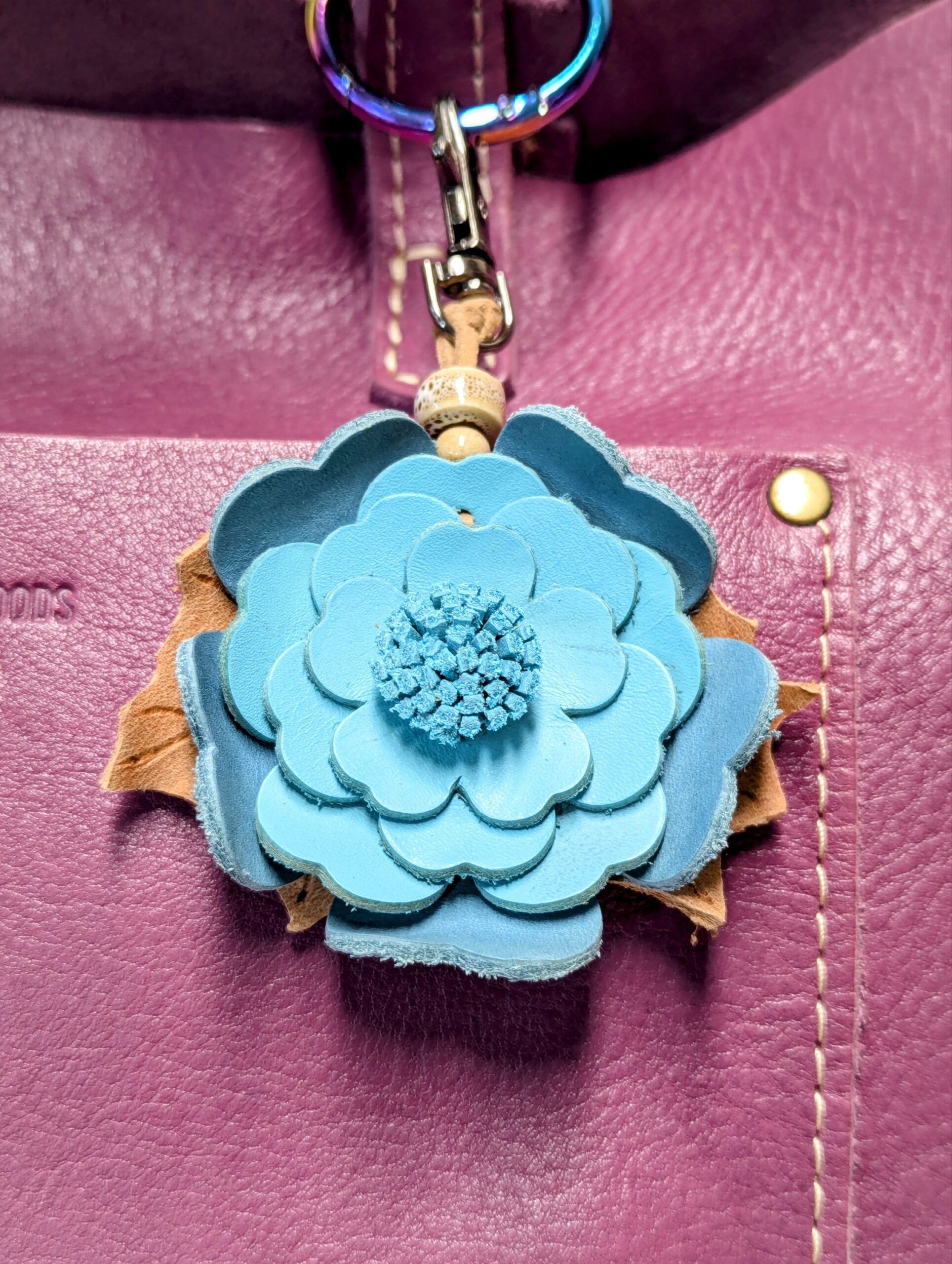 #388-This Dazzle Designs Jewelry purse charm is a one-of-a-kind creation and cannot be duplicated. It’s handcrafted to blend elegance with quality and individuality; made with premium materials, full grain leathers, and eye-catching details, these charms elevate any handbag with a touch of sparkle and style. I have used gunmetal hardware and the approx. length from top of swivel clasp to bottom of flower charm is 4.5 inches.