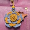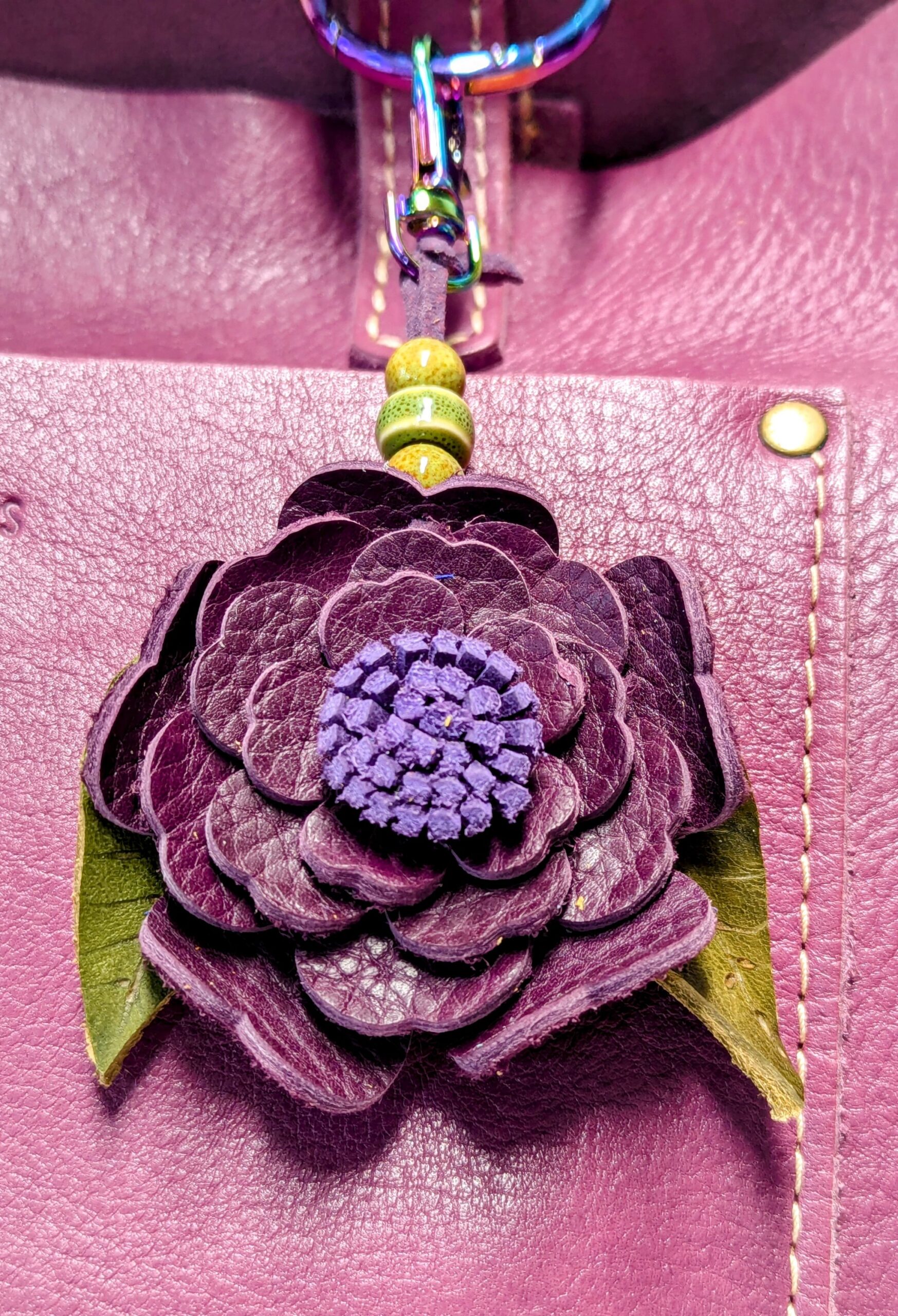 #391-This Dazzle Designs Jewelry purse charm is a one-of-a-kind creation and cannot be duplicated. It’s handcrafted to blend elegance with quality and individuality; made with premium materials, full grain leathers, and eye-catching details, these charms elevate any handbag with a touch of sparkle and style. I have used chromalusion hardware and the approx. length from top of swivel clasp to bottom of flower charm is 4.5 inches.