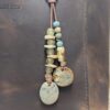 #436- A Lovely Hand Etched Bronze Pendant and Leather Lilies Purse Charm made with 12 multi shades of brown leather lilies created from beautiful SoRetro leathers suspended on vegan suede leather strands. I have also added a mini strand of semi precious gemstones. Approximate length from top of swivel clasp to bottom of lowest lily is approx. 8 inches. I used ant. bronze hardware on this particular charm.
