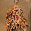 #458- A Lovely Hand Etched Gunmetal Pendant and Leather Lilies Purse Charm made with 12 multi shades of teal and purple leather lilies created from beautiful SoRetro leathers suspended on vegan suede leather strands. I have also added a hand etched gunmetal pendant that I made. Approximate length from top of swivel clasp to bottom of lowest lily is approx. 8 inches. I used gunmetal hardware on this particular charm.