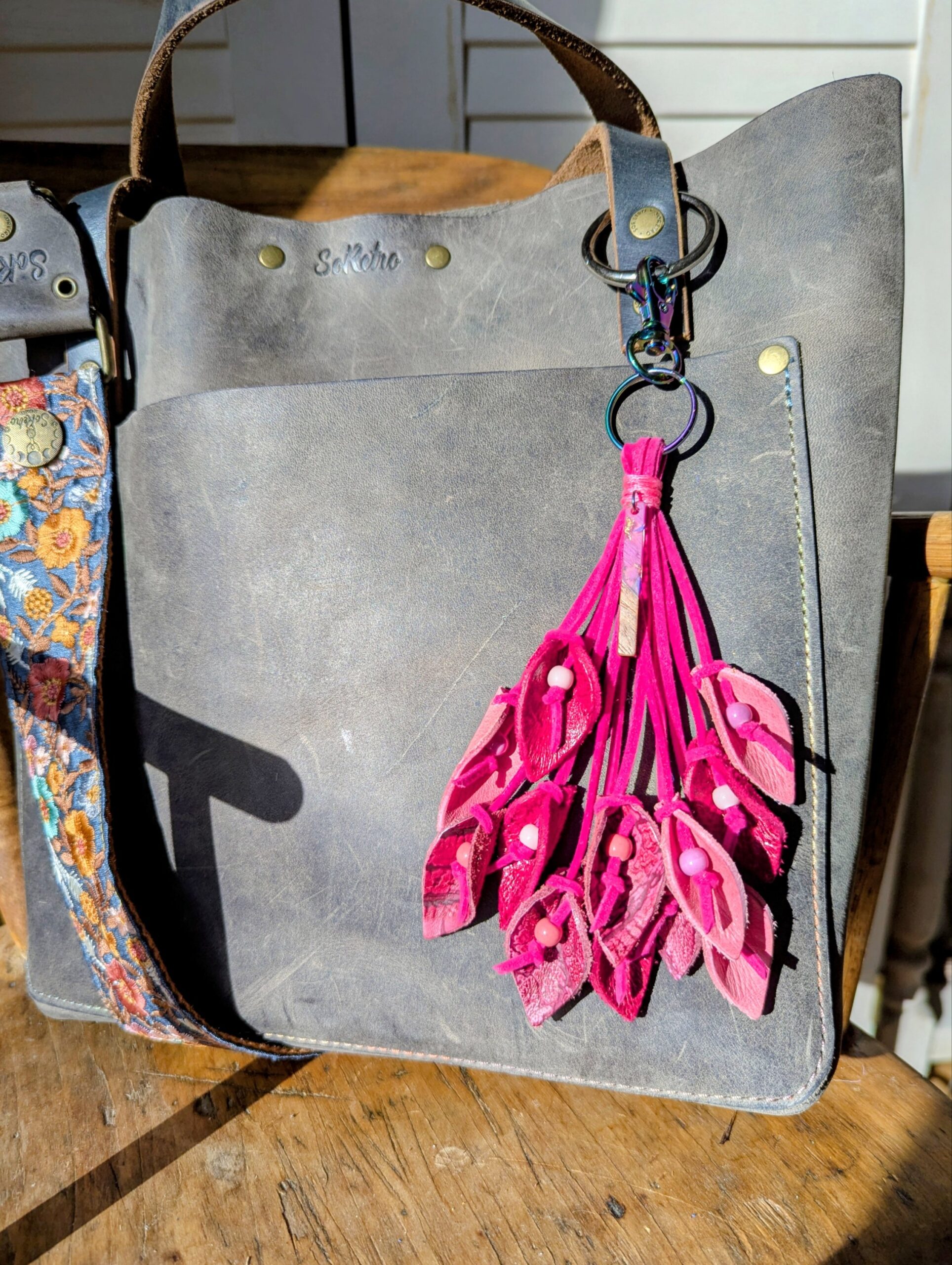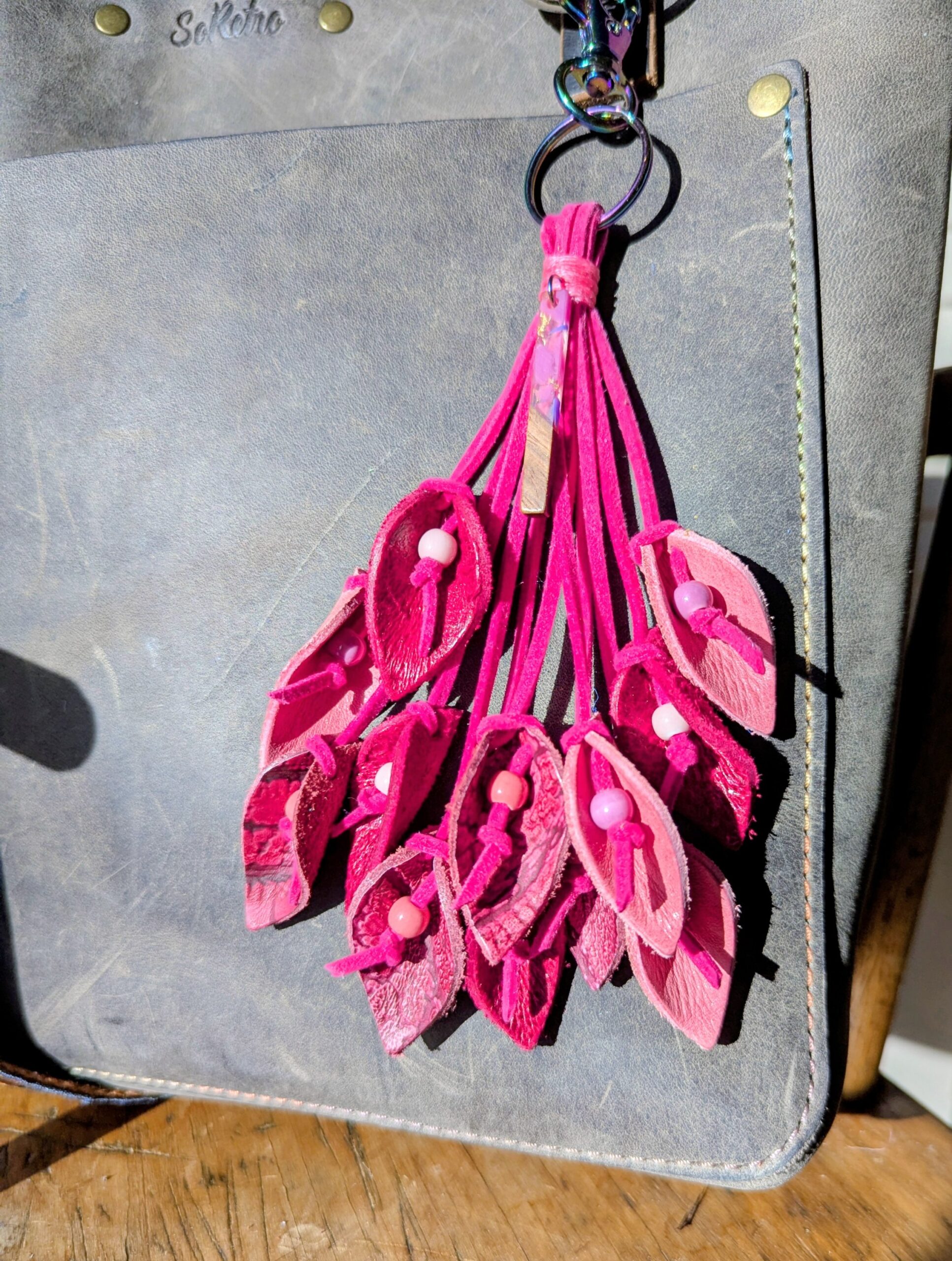 #656-A lovely SoRetro Leather Lilies Purse Charm. I created this using multi colored leather lilies in lovely shades using beautiful SoRetro leathers. Each lily has a center bead and I also added a stunning pendant. Approximate length from top of swivel clasp to bottom of lowest lily is approx. 7.5 inches. I used chromalusion (rainbow) hardware on this lovely charm.