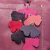#462- Lovely MCM Pendant and Leather Lilies Purse Charm made with 12 multi colored leather lilies in gorgeous shades created from beautiful SoRetro leathers suspended on vegan suede leather strands. Each lily has a coordinating ceramic bead and I have added this adorable pendant. Approximate length from top of swivel clasp to bottom of lowest lily is approx. 8 inches. I used silver hardware on this particular charm.