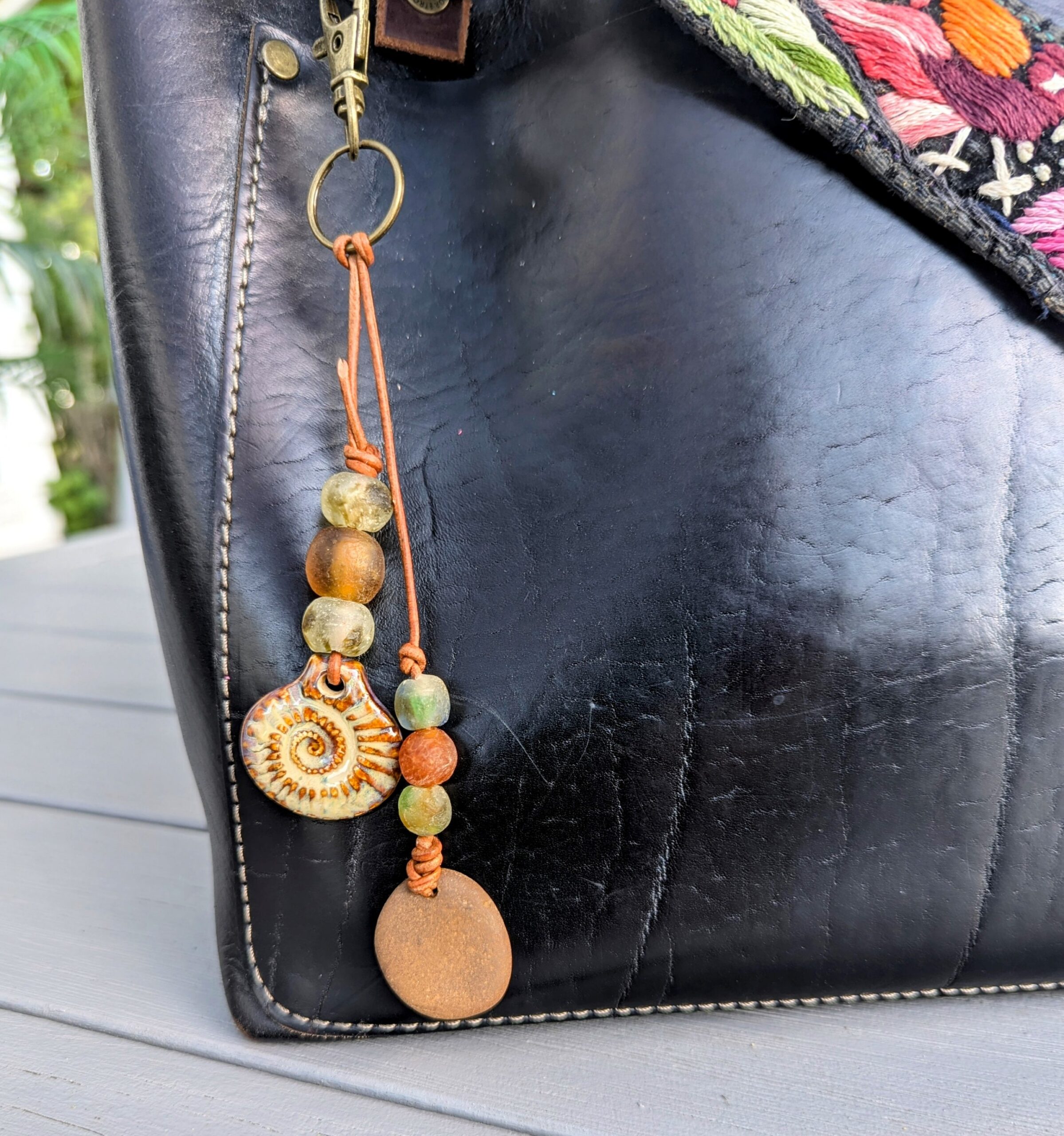 #339-Nature’s Beauty Purse Charm created using 2mm leather, a lovely porcelain sea shell, recycled glass beads and a stone I found in the Upper Peninsula of MI and then hand drilled. I used bronze hardware.
