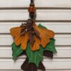 “Oak Leaves and Acorn Dreams” Purse Charm . A lovely bronze oak leaf and a sweet acorn charm suspended on three hand cut SoRetro leather leaves. This purse charm is made with bronze hardware and a beautiful glazed ceramic bead and 2 wooden beads above the pendant! You will love the beautiful colors of this Fall creation!