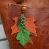 “Owl in the Leaves” Purse Charm . A sweet baby bronze owl suspended on three hand cut SoRetro leather leaves. This purse charm is made with bronze hardware and a beautiful glazed ceramic bead above the pendant! You will love the beautiful colors of this Fall creation!
