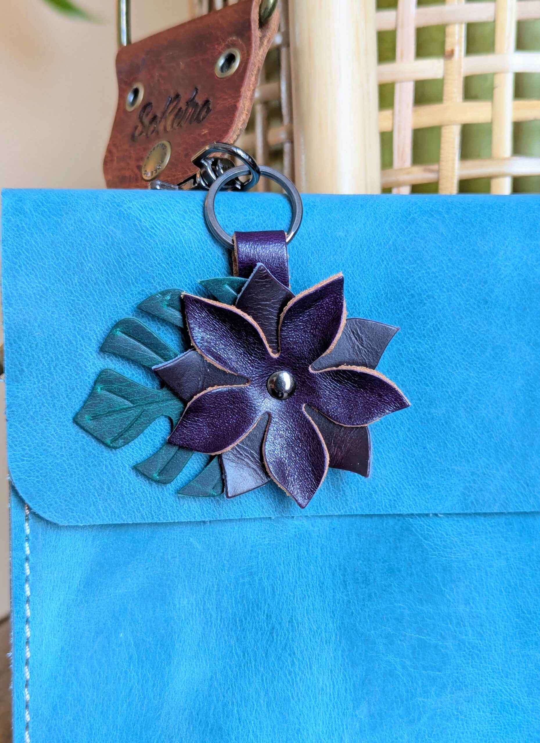 #542-Petite Flower Leather Purse Charm. Made with a set of two SoRetro leather flower petal layers. I then suspended it with a lovely leaf behind the double layer of petals. The hardware I used on this is gunmetal!