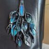 #543-Petite Flower Leather Purse Charm. Made with a set of two SoRetro leather flower petal layers. I then suspended it with a lovely leaf behind the double layer of petals. The hardware I used on this is gunmetal!