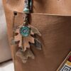 “Remnants of Paradise” Sari Silk Purse Charm made from beautiful shades of my hand dyed Sari Silks, lovely sun and moon pendants, and a hand cut SoRetro leather oak leaf. I have also added a lovely strand of multi colored greek seed beads and a strand of teal glass beads with an aged clay bead and aqua crystal. All bronze hardware used.