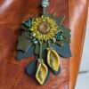 #480a-Fall Vibes Purse Charm. An adorable crescent moon pin pendant on this etched set of SoRetro leather leaves. I have also added a set of lovely leather lilies! This purse charm is made using ant. bronze hardware and lovely porcelain beads above the charms! You will love this sweet Fall/Halloween creation!