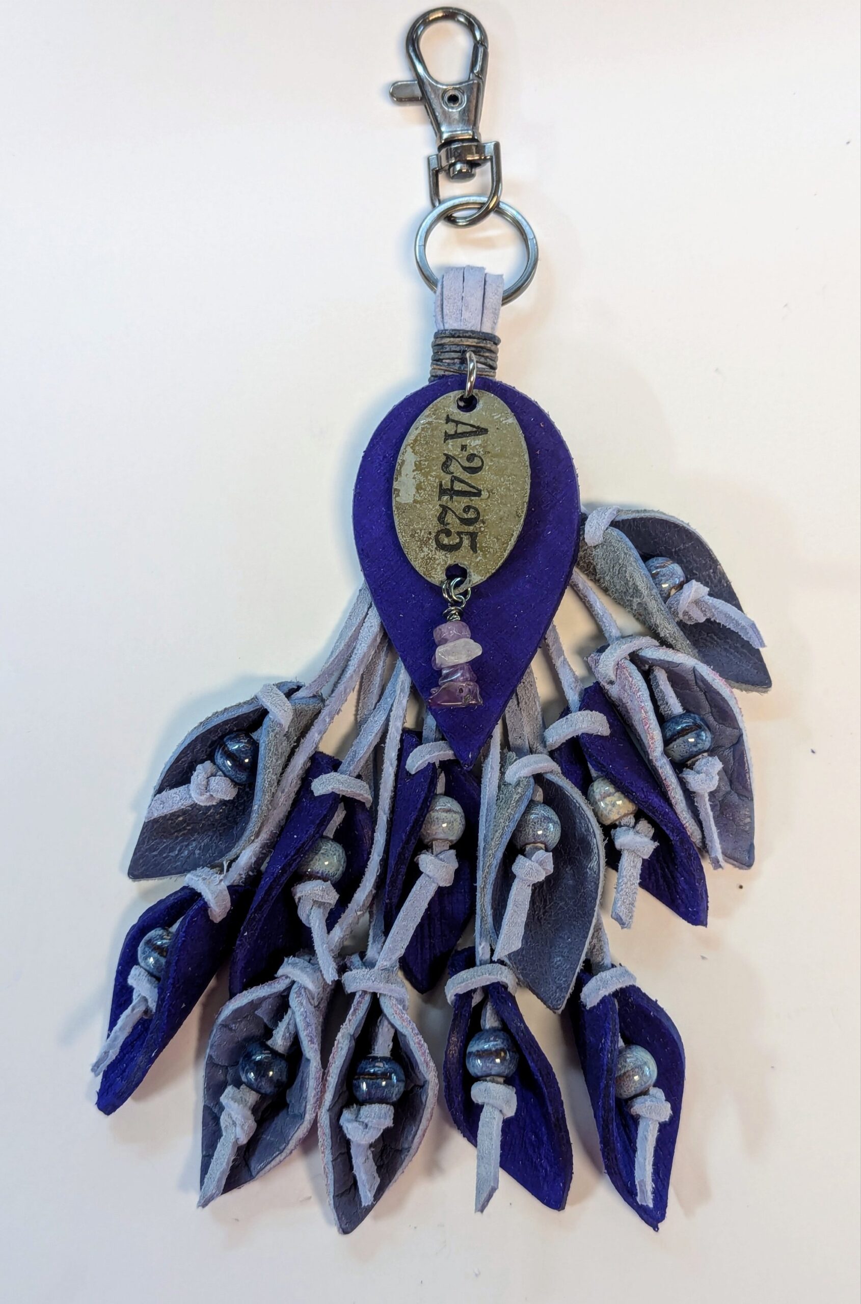 A Custom Lovely Leather Lilies Purse Charm made with 12 multi shades of purple/lavender leather lilies created from beautiful SoRetro leathers suspended on vegan suede leather strands. I have also added a mini strand of semi precious amethyst gemstones and a vintage tool check tag. Approximate length from top of swivel clasp to bottom of lowest lily is approx. 8 inches. I used gunmetal hardware on this particular charm.