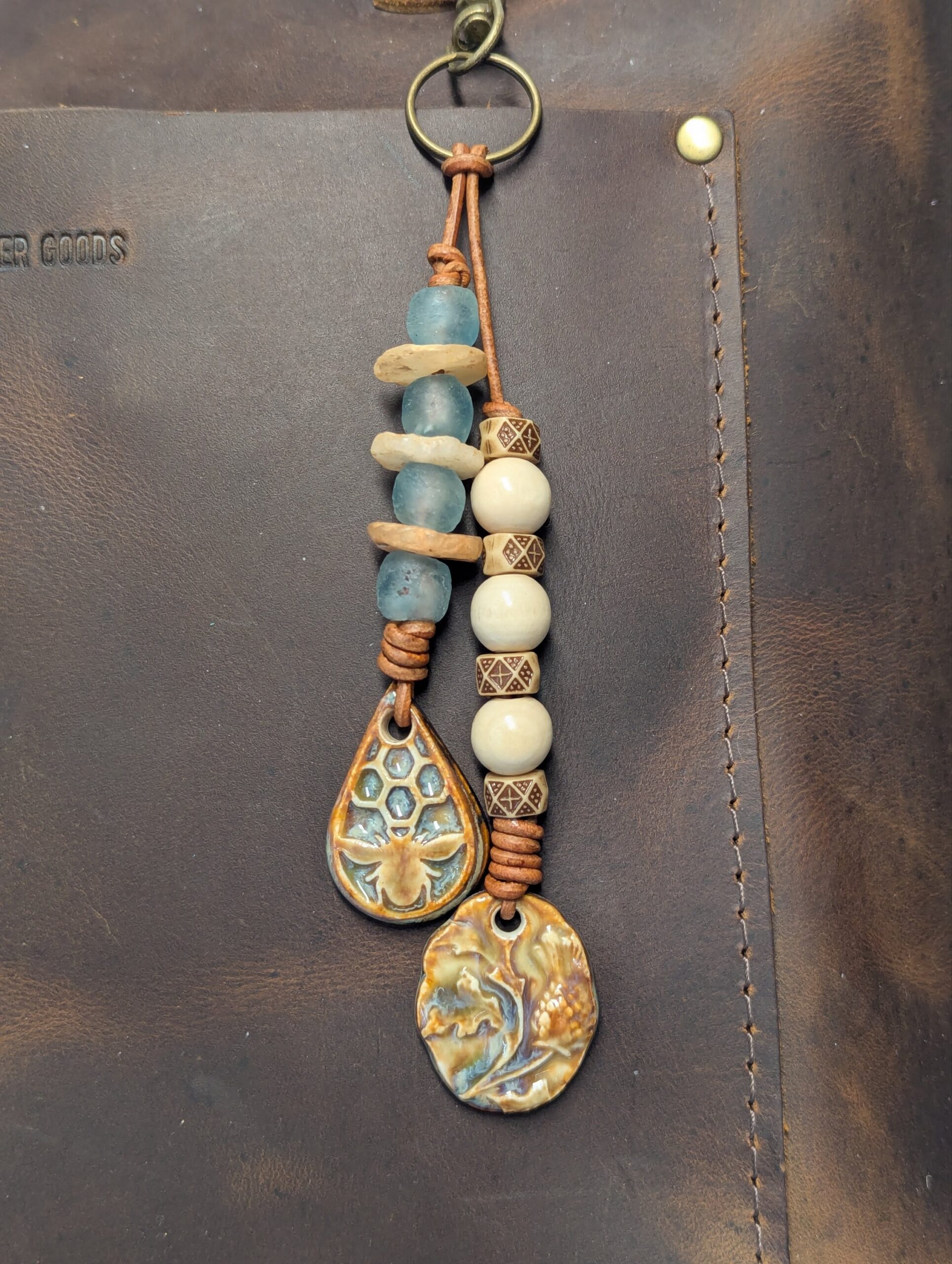 Custom Nature’s Beauty Purse Charm created using 2mm leather, two lovely porcelain pendants, recycled glass beads, glass stones, round wooden beads and using bronze hardware.