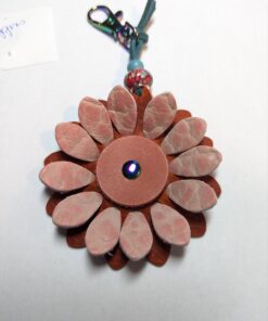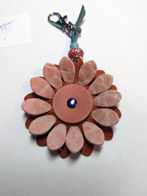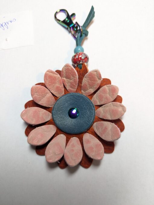 #71- New Flower Power Purse Charm. Made with a set of two SoRetro leather flower petal layers, a center leather piece and then suspended with a beautiful set of ceramic beads on a lovely clasp. I used chromalusion hardware.